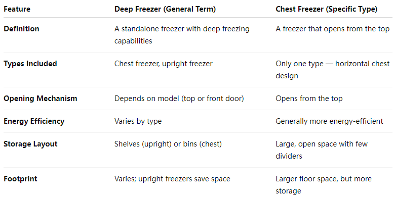 যদিও "ডিপ ফ্রিজার" শব্দটি দীর্ঘমেয়াদী খাদ্য সঞ্চয়ের জন্য ডিজাইন করা সমস্ত স্বতন্ত্র ফ্রিজারকে অন্তর্ভুক্ত করে, একটি চেস্ট ফ্রিজার সেই বিভাগের মধ্যে একটি নির্দিষ্ট শৈলী। এই পার্থক্য বোঝা আপনাকে আপনার সঞ্চয়স্থানের চাহিদা, স্থান এবং বাজেটের উপর ভিত্তি করে আরও সচেতন কেনার সিদ্ধান্ত নিতে সাহায্য করতে পারে।